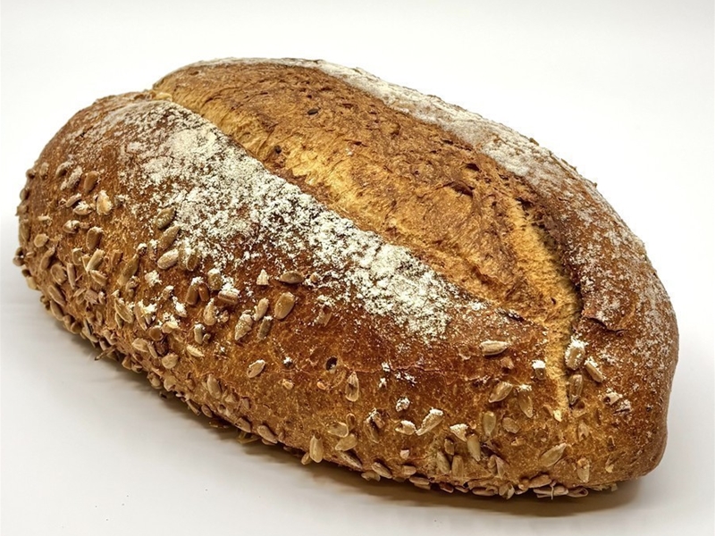 Een bruin brood op basis van tarwemeel en tarwebloem. Gebakken op zonnebloempitjes. heerlijk om zelf aan te snijden.
